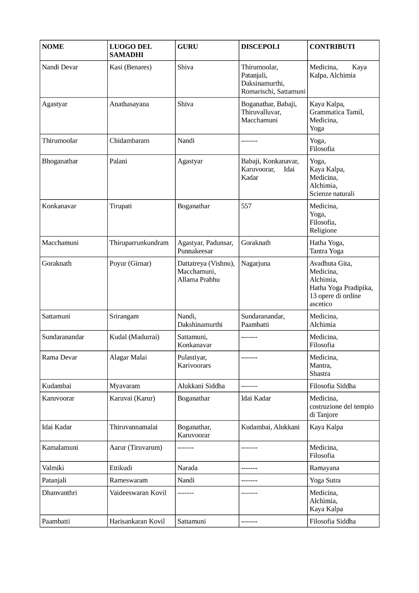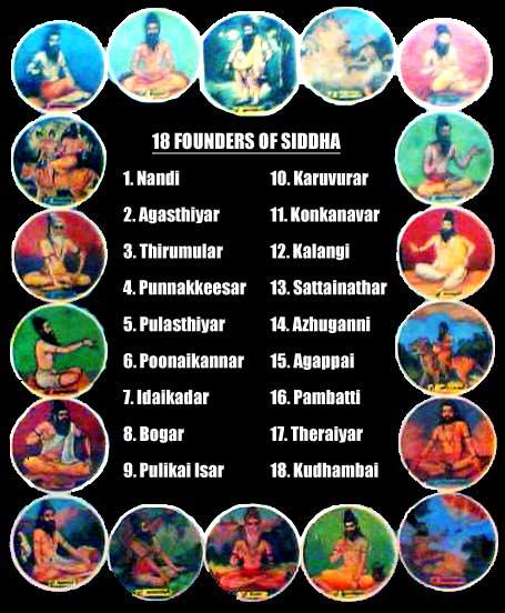 In accordo alla tradizione dell'India meridionale, esistono diciotto maestri Siddha. Si narra che questi Siddha abbiano raggiunto la perfezione, mediante la sublimazione dei corpi spirituale, intellettuale, mentale, vitale e fisico.